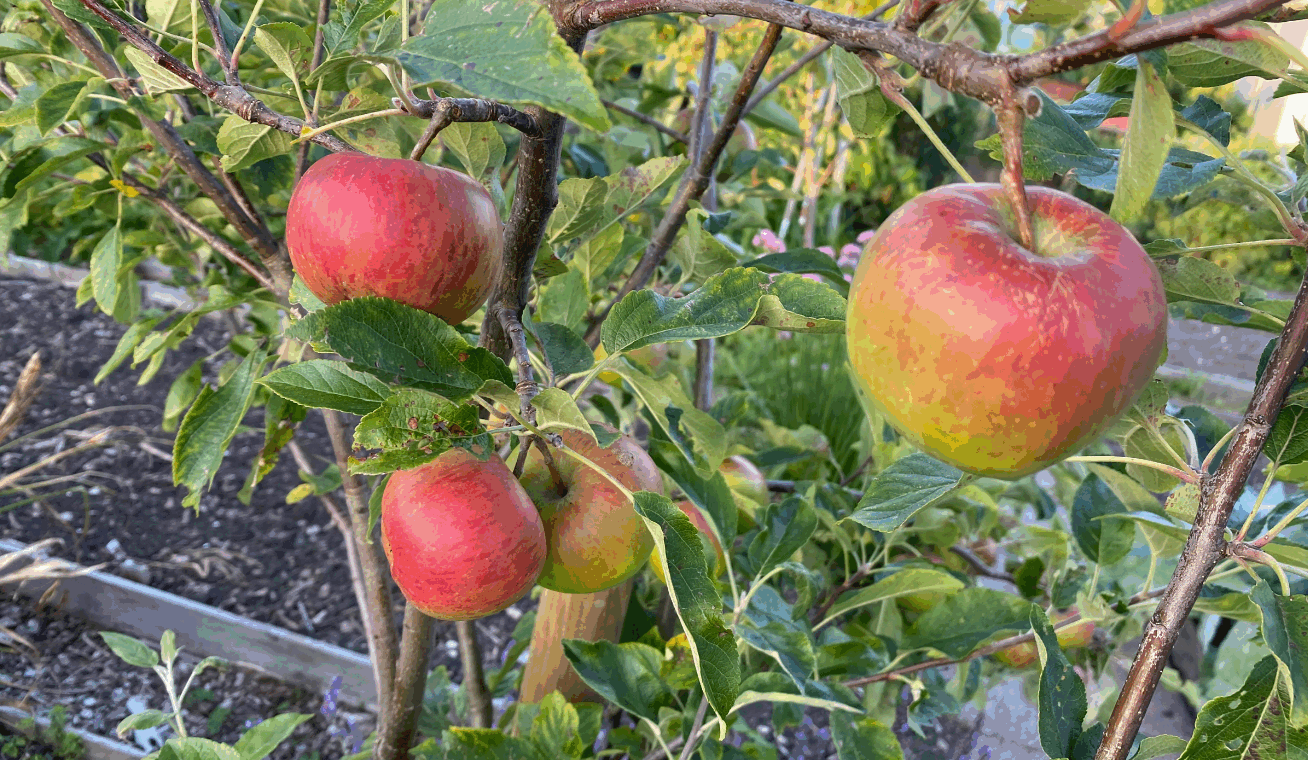 Soms hangen er zoveel appels aan de takken dat ze dreigen te breken. Plaats in dat geval stutten onder de takken of dun de vruchten uit zodat de boom niet uitgeput raakt. Dit zorgt ook voor grotere en mooiere appels.